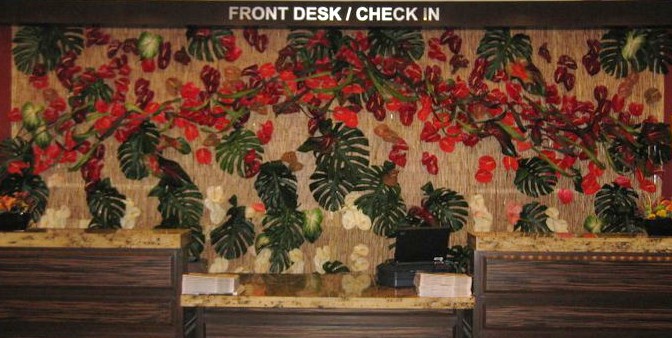 Red anthuriums, monstera leaves and phaelonopsis orchids created a path along this wall mural.