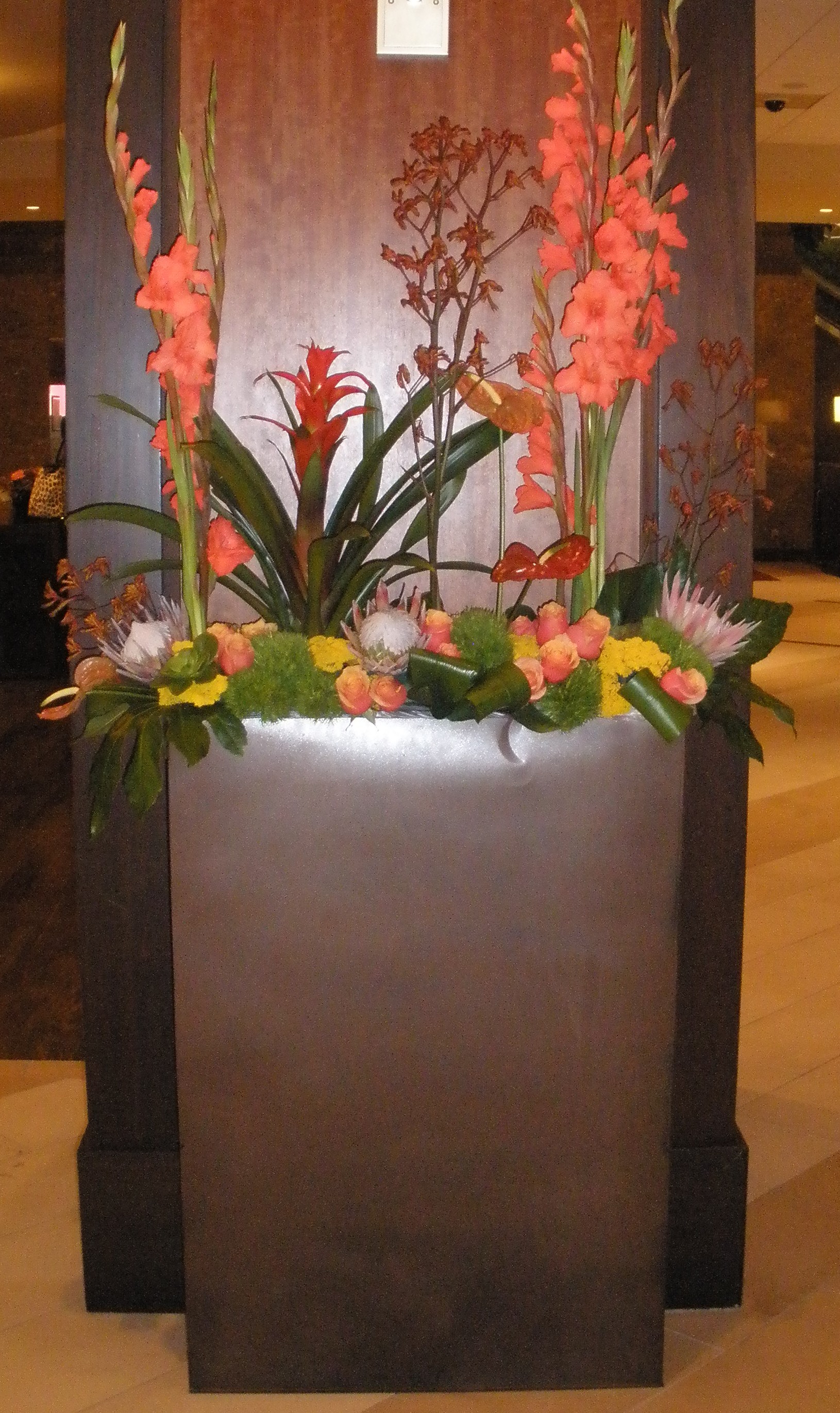This grand arrangement in the hotel lobby included eremurus reaching high.